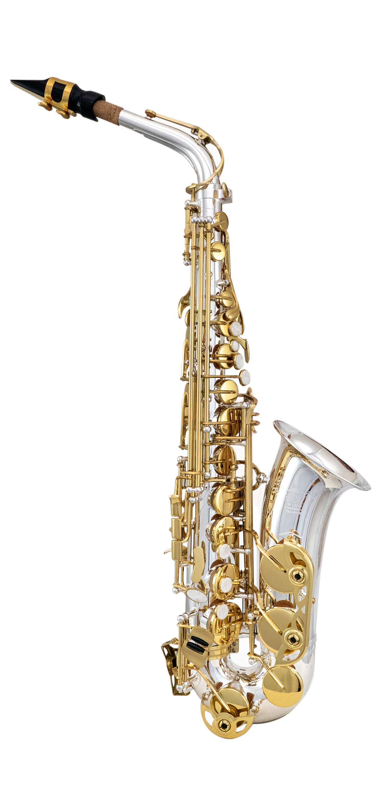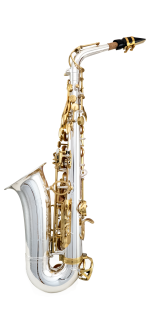 | Sax Alto Mib, Acabamento corpo Prata e chaves Dourada, Campana removível, Fa# Agudo e Sib Grave Articulado, Apoio polegar Regulável, Porta Lira, Botões em Madrepérola, molas agulha, cortiças natural Acompanha, Case